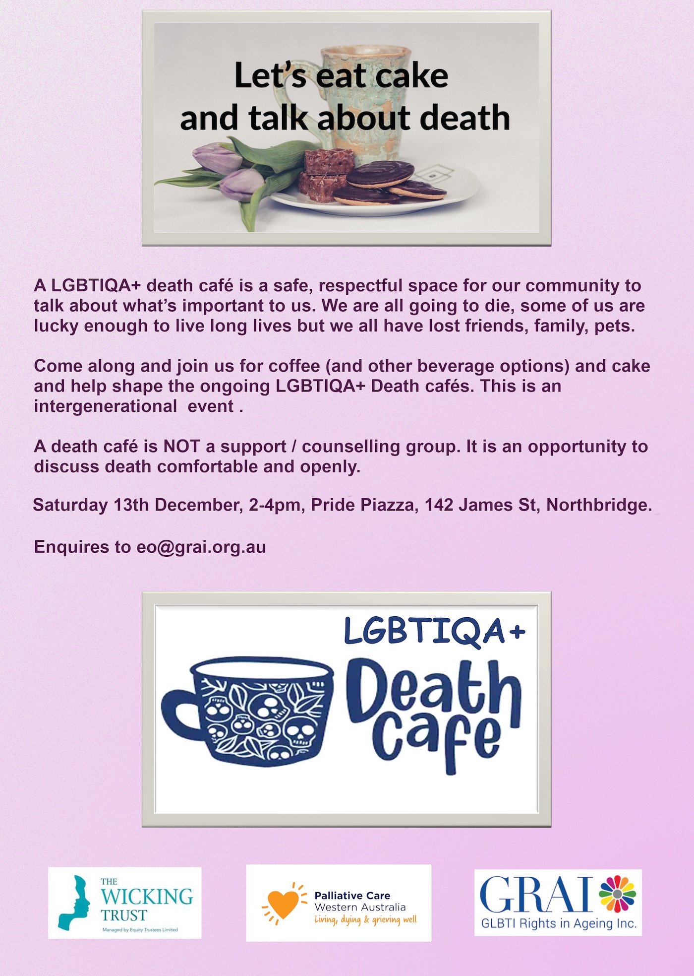 GRAI is offering regular workshops on end-of-life planning (Wills, Advanced health directive, Enduring Power of Attorney, Enduring power of Guardianship, Funeral options, Voluntary Assisted Dying), These workshops provide information that can assist you to make the decisions that reflect your life choices.