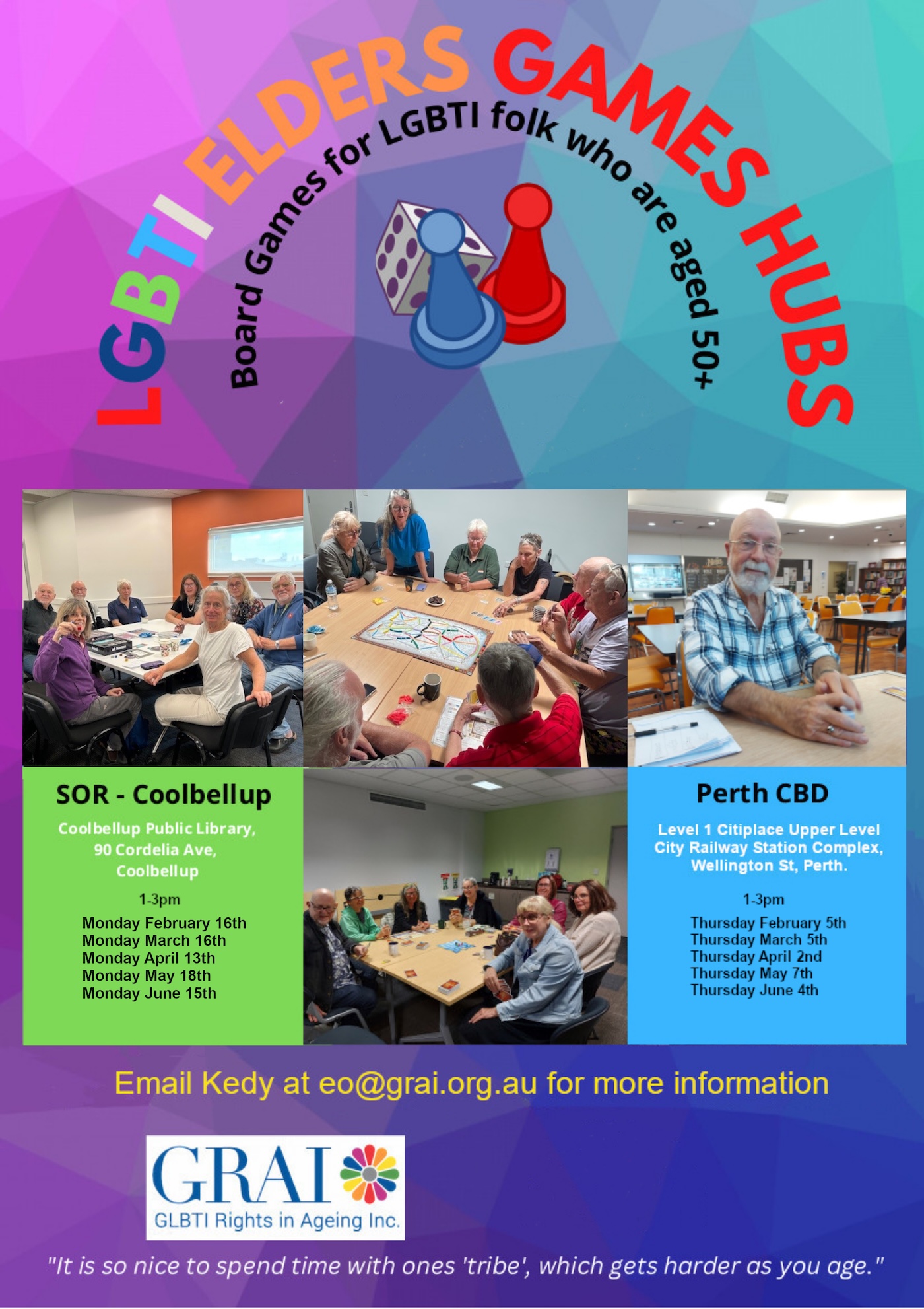 GRAI’s Games Hubs are for LGBTI people aged 50 and over. We play interesting games that are not super competitive, but are fun and give us all a bit of a laugh.